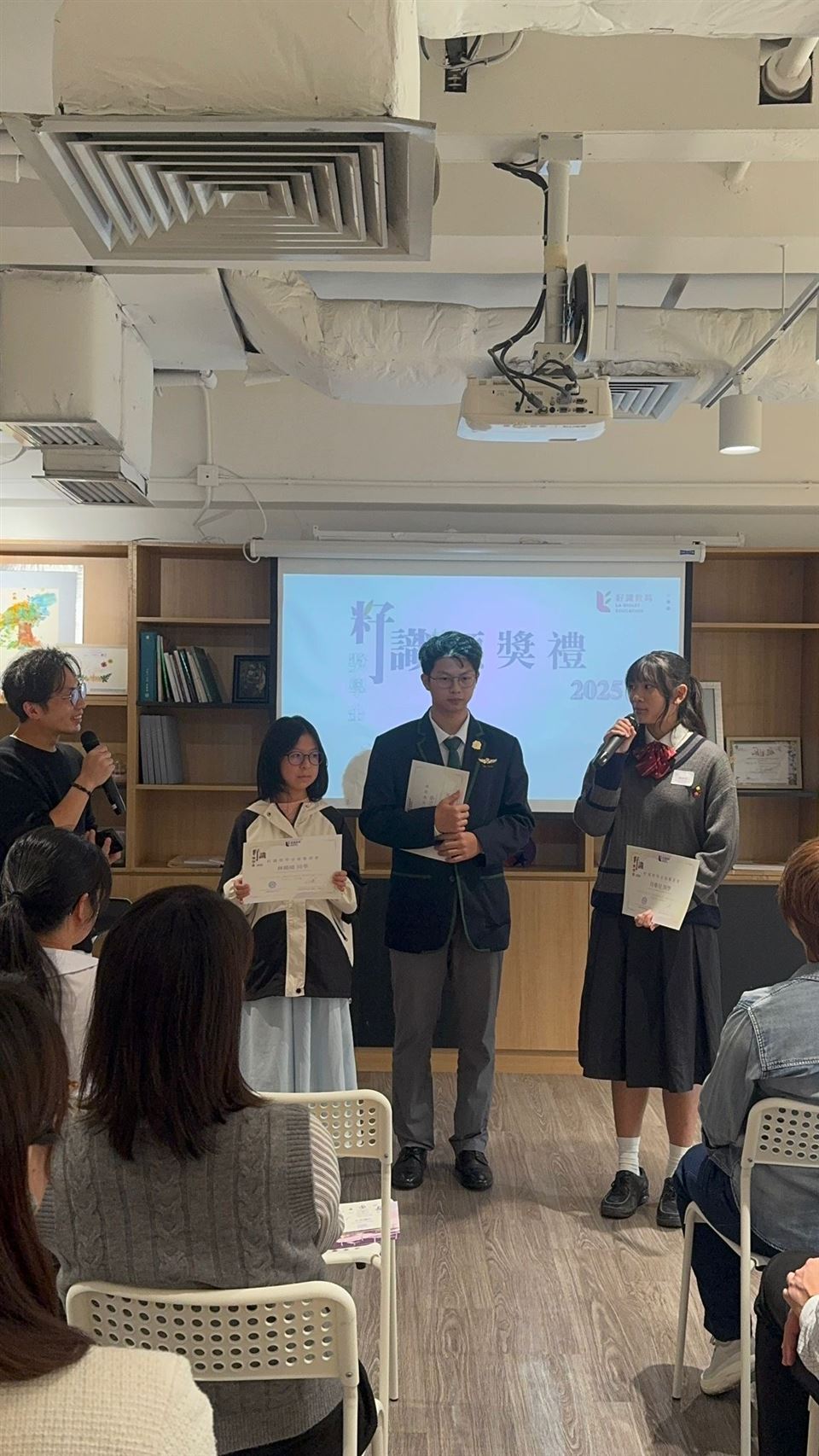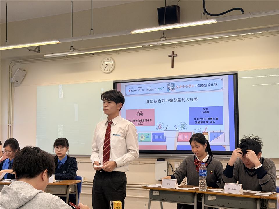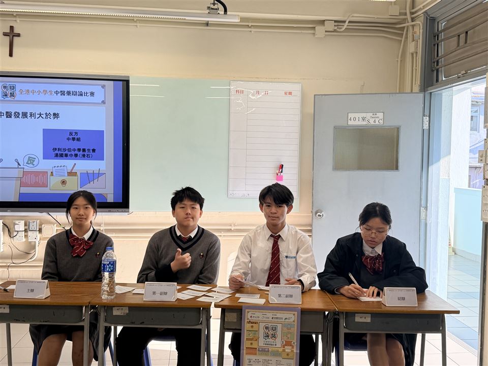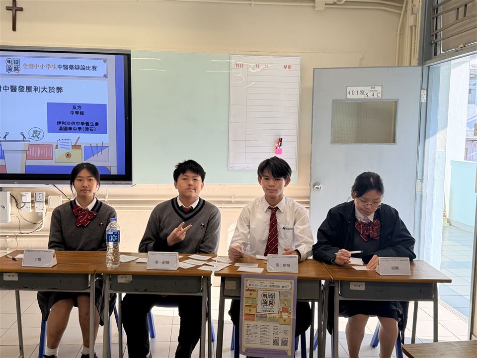 我校主辯為4A吳欣怡同學,一副為4A 方意喬同學,二副為4A林曦同學,結辯為4A 張樂瑤同學。我校最終以2:1惜敗蕭明,但一副方意喬由於其優秀表現,最後獲得本場最佳辯論員。