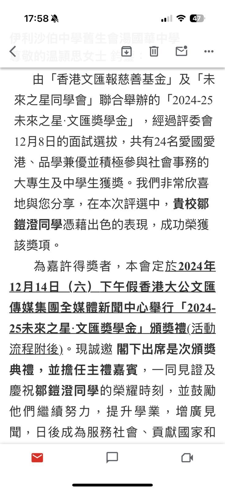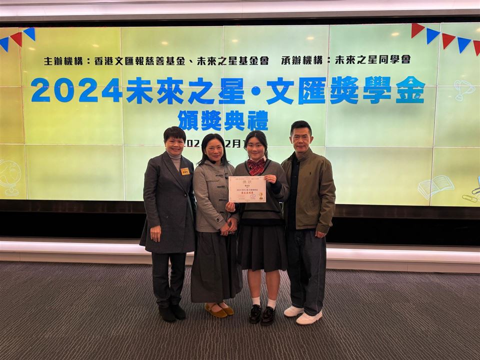 中六級鄒鎧澄同學、其父母、校長一同岀席2024未來. 文匯獎學金頒獎典禮。同學獲得獎項實有賴全體同事的努力。在此亦感謝馬灝儀老師統籌同學申請獎學金工作。