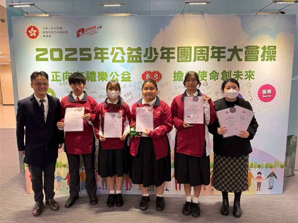 本校6名同學5A 郭穎芝、周樂兒 、5B 孔令楠、吳雪琳、6A 郭汶琦、李丞哲獲得公益少年團高級獎章以鼓勵學生自發參與各項服務活動的策劃及推行。本校同時獲得積極團隊獎及優秀團隊獎。