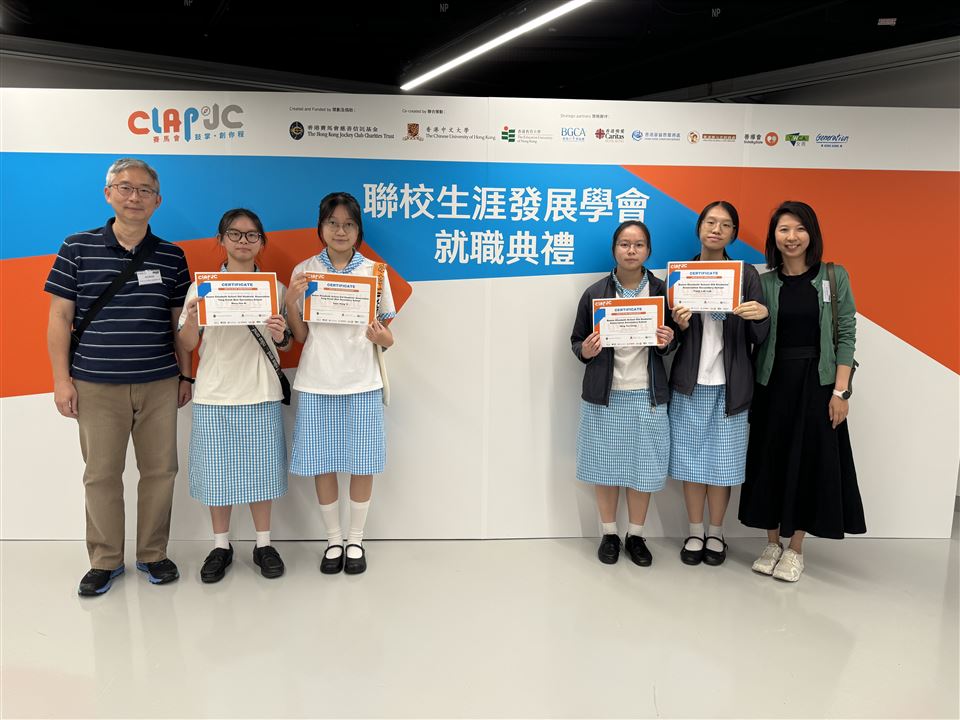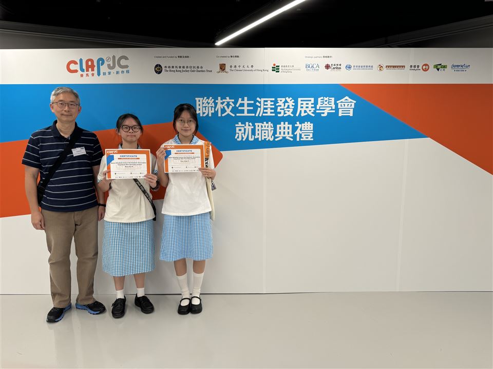 「賽馬會鼓掌.創你程計劃」 聯校生涯發展學會就職典禮於14/9/2024舉行。經過6個月的訓練,包括領袖訓練、設計思維工作坊、VASK職業卡工作坊、性格透視體驗、真人圖書館、暑期興趣活動等,中五級黃芷妮及袁杏宜同學獲頒生涯發展大使委任證書。會上,我們和各友校的師生互相祝賀,分享彼此在學校推行學生生涯發展工作的心得。在未來的六個月,各校的生涯發展大使將會聯手合作,策劃大型的展覽會,邀請商界領袖為聯網學校的同學,分享個人職涯故事和對未來職場的看法,請同學熱切期待。